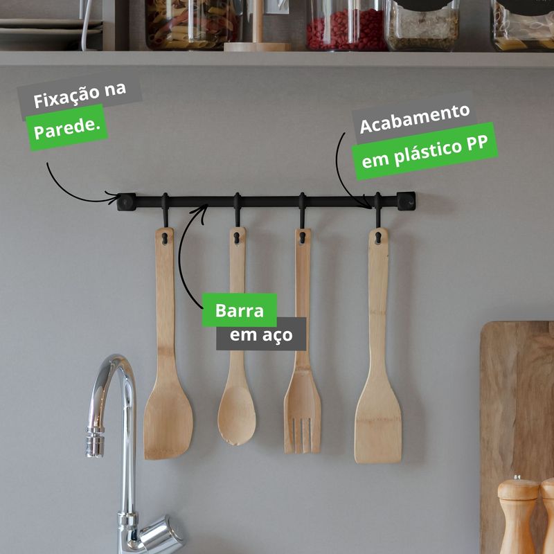 A cozinha é o coração da casa! O ambiente mais frequentado de um lar, o cantinho de convivência entre família e amigos e um refúgio acolhedor para aqueles que estão se arriscando em novas descobertas culinárias ou já são expert no universo gourmet. De um jeito ou de outro, uma cozinha completa e funcional precisa de utensílios especiais para preparar e servir com pouco esforço e muita agilidade! A Barra Pequena possui acabamento em aço termoplastificado e acompanha 4 Ganchos de polipropileno. Além de livrar a bancada, otimizar espaços e organizar os utensílios de maneira inteligente, o item permite criar um ambiente prático, moderno e funcional, com tudo à mão. A barra é multiuso e pode ser usada também em outros ambientes. No Hall de Entrada e no Quarto, como suporte de bolsas, mochilas e casacos, e na Lavanderia, como suporte de roupas ou vassouras e rodos, por exemplo.