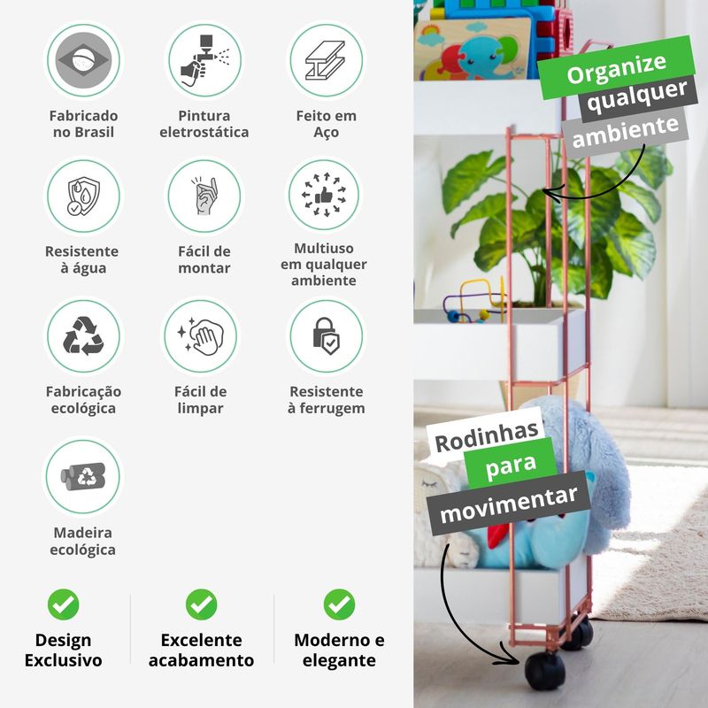 • Mobilidade e Flexibilidade: Com rodinhas, permite o transporte fácil e rápido de itens de um lugar para outro na casa ou escritório;• Otimização de Espaço: Com suas 3 prateleiras, ajuda a aproveitar verticalmente o espaço, ideal para locais com área limitada;• Organização: Separa e organiza diferentes tipos de itens, evitando a bagunça e tornando mais prático o acesso a eles;• Durabilidade e Resistência: Feito de aço, garante uma longa vida útil e capacidade de carregar itens mais pesados;• Versatilidade: Pode ser utilizado em diferentes ambientes como cozinha, banheiro, escritório, quarto, entre outros;• Acesso Fácil: As prateleiras abertas oferecem fácil visualização e acesso aos itens armazenados;• Design Moderno: Além de funcional, adiciona um toque de modernidade e sofisticação ao ambiente.