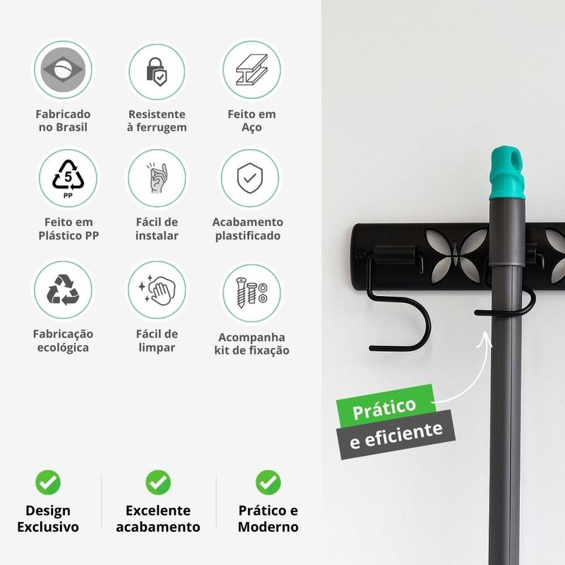 • Otimização de espaços;• Praticidade para o dia a dia;• Discreto para organizar vassouras;• Não atrapalha a circulação na área de serviço; • Resistente à umidade